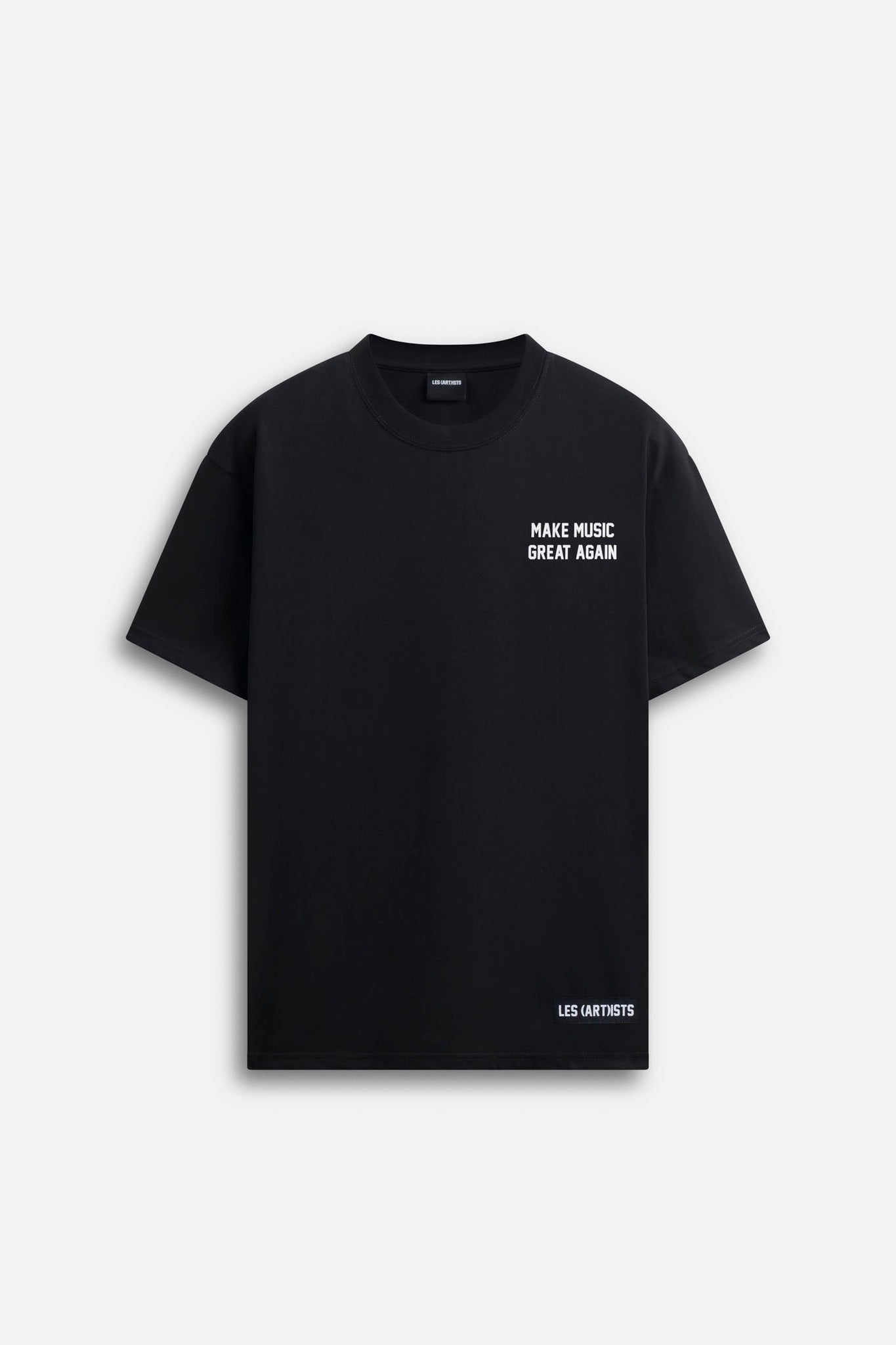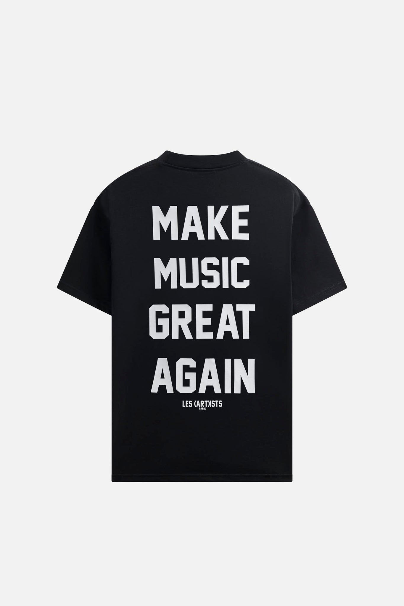 The T-shirt Make Music Black/White redefines boldness through contrast and texture. Cut from premium cotton with a washed effect, it features a small chest print reading “Make Music Great Again” and a large back print of the same slogan in white brick style. A striking streetwear piece blending clarity and attitude.