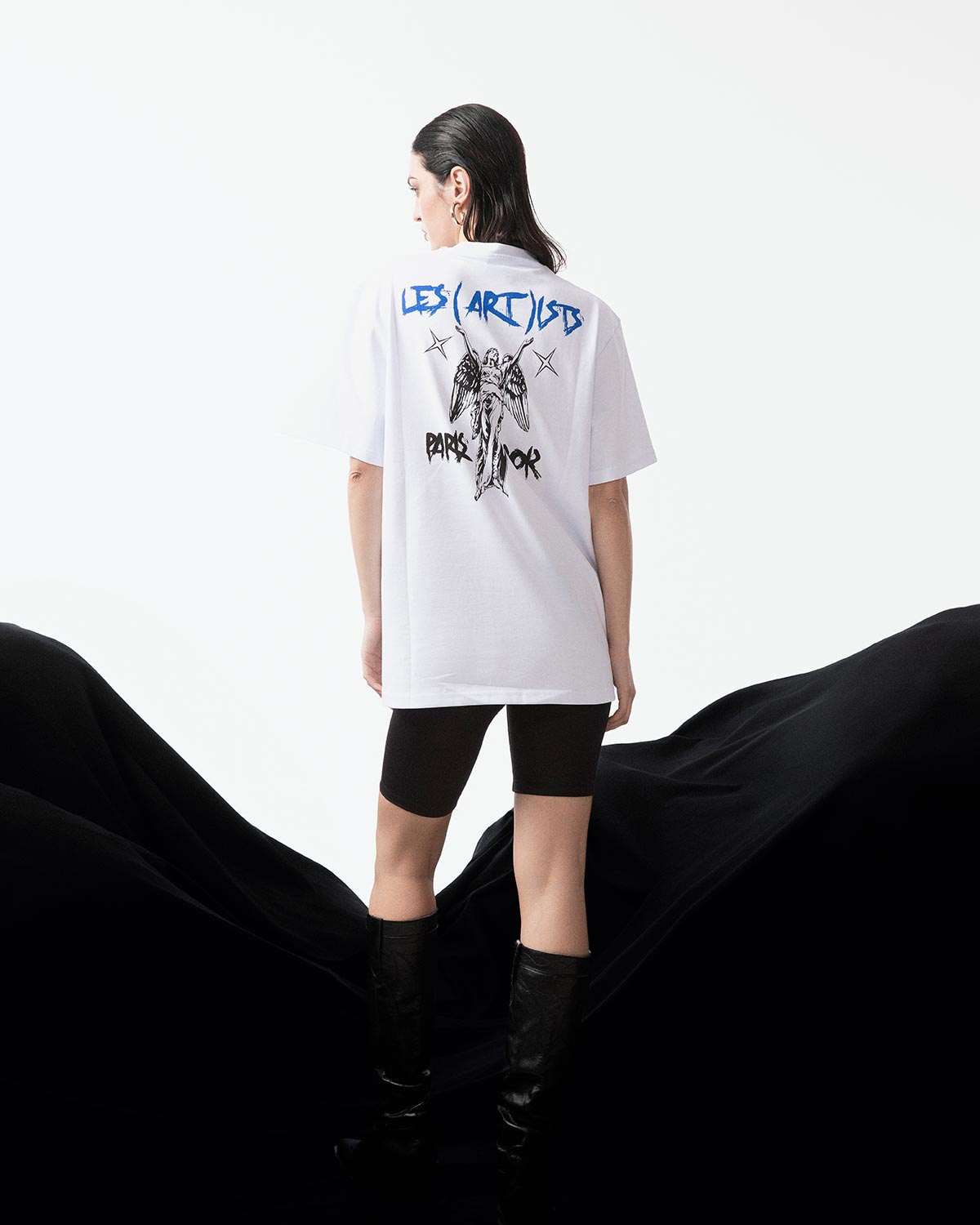 The LES (ART)ISTS Paris Victory t-shirt is a bold statement piece inspired by music, rebellion, and artistic expression. Crafted from high-quality cotton, this White t-shirt features a striking front design with a minimalist LES (ART)ISTS logo and a detailed angel graphic. The back showcases a powerful angel illustration, complemented by dynamic blue lettering and bold typography that embodies the spirit of Paris. Perfect for those who embrace edgy streetwear with a touch of art and culture.