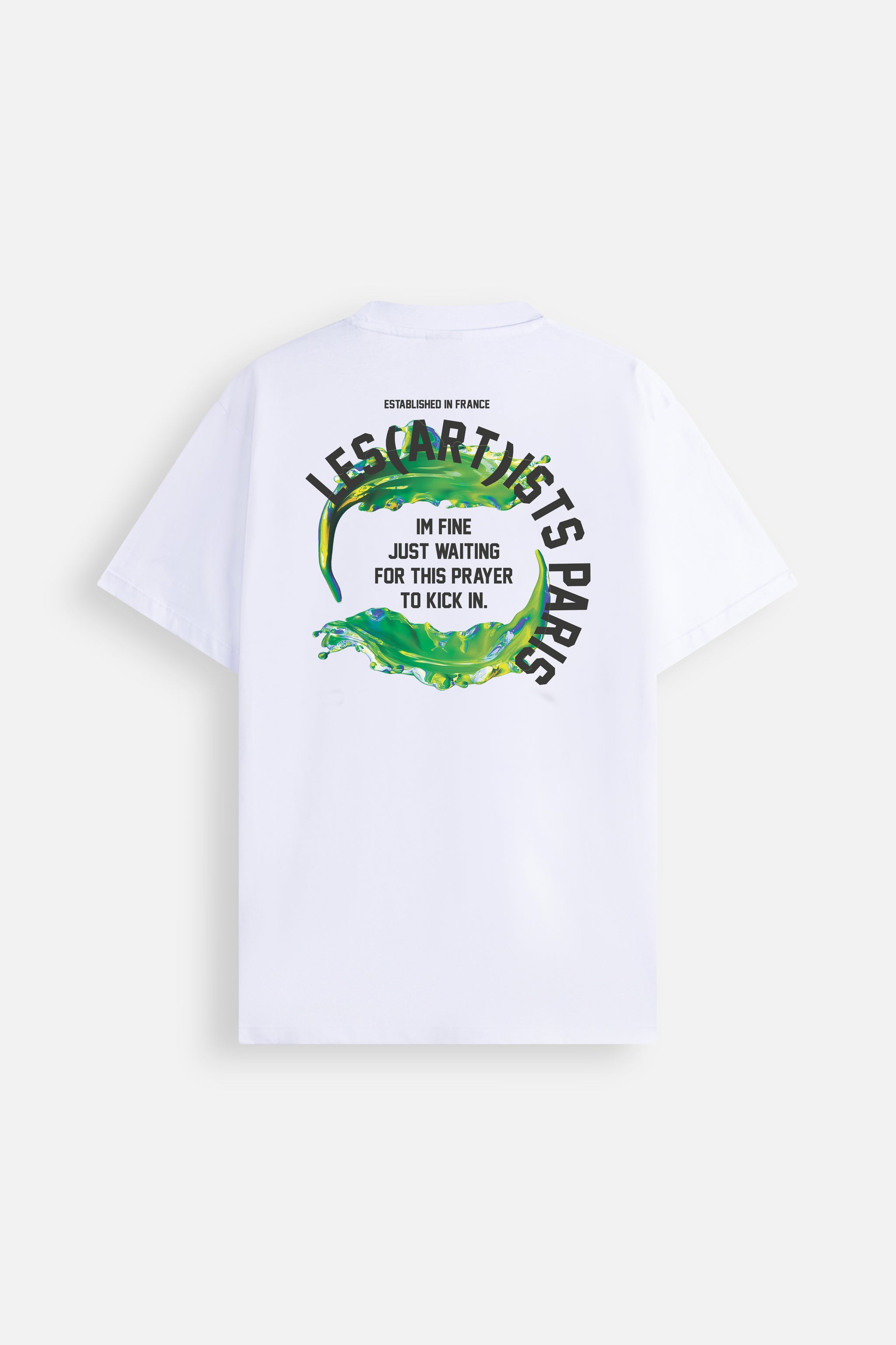 The Prayer embodies movement and evolution, inspired by abstract fluidity and modern aesthetics. Made from premium cotton, this tee features a dynamic back print with swirling patterns and a futuristic vibe. With its minimalist LES (ART)ISTS logo on the front and bold design on the back, it's a statement piece that reflects creativity and innovation.